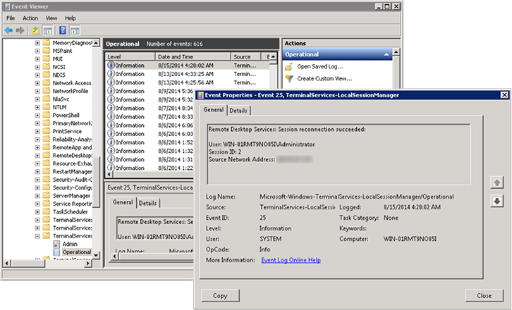 Under that view, double-click to open the ‘Operational’ view. You can double-click the entries to see more information about when they were logged, including the origin IP address: