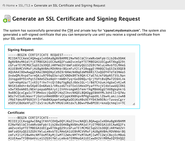 On the next page, copy the contents of the Signing Request box. This certificate request will be required by the company where you purchase the SSL certificate. If you have not purchased a commercial SSL yet, we offer them as low as $9.95 per year.
