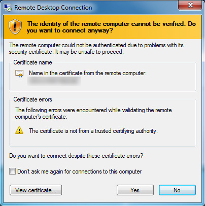 Note: Your VPS “cannot be verified” because the security certificate used by the VPS is self-generated and self-signed at the time of VPS installation. Despite this warning, the RDP connection to your VPS is encrypted and highly secure. There should be no concern about connecting to the VPS, because you are its Administrator!